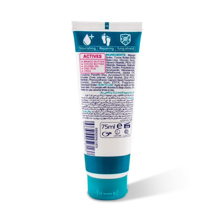 ترمیم کننده های پا،آبرسان وبهبود دهنده خشکی پوست پا،نرم کننده عالی ومغذی پوست،ضدالتهاب وجلوگیری از عفونت های قارچی ،لایه برداری ملایم و حذف سلول های مرده پوست