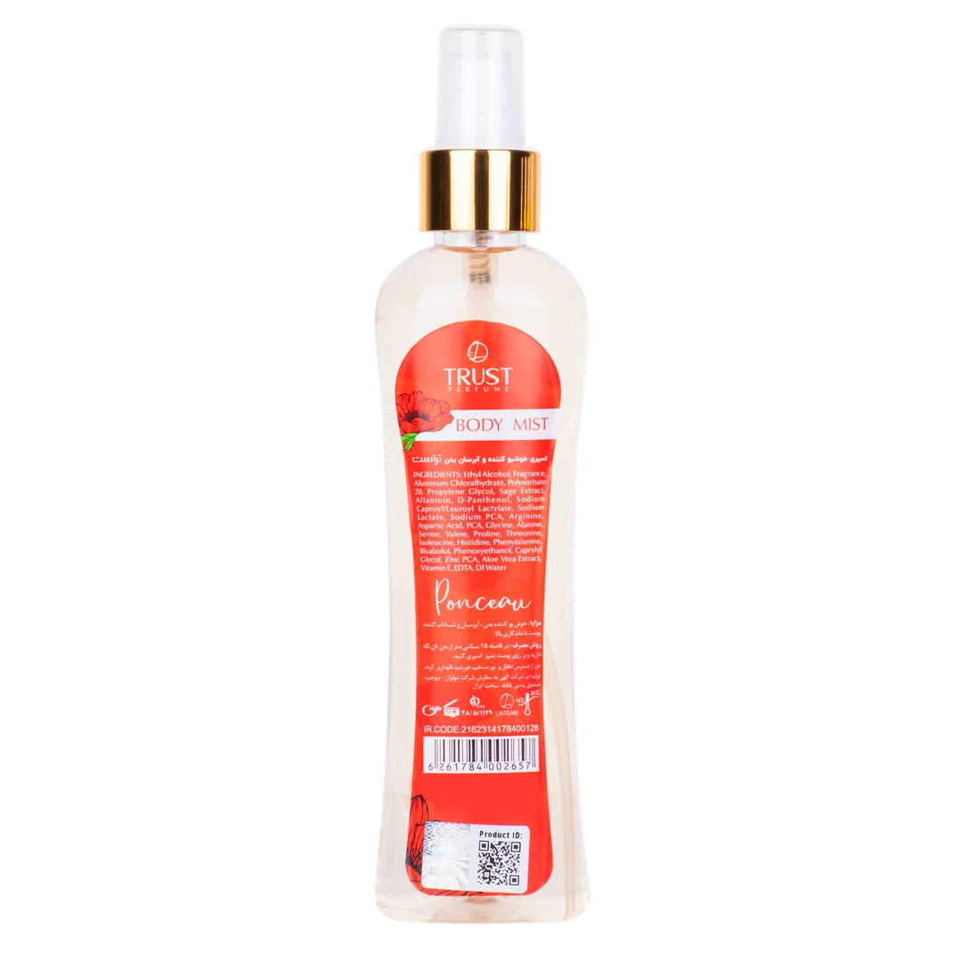حجم200 میلی لیترفرم محصولاسپریجنسیت مصرف کنندهبانواننوع رایحهگلی میوه اینت هاانار،هلو،سیب،پئونی قرمز،گل همیشه بهار،اسمانتوس،وانیل،عرق نیشکر،مارشملو،چوب بلوطمدت انقضاء36 ماهشماره پروانه بهداشت1129 ظ 48بازه زمانی مصرف محصول بعد از باز شدن12 ماه